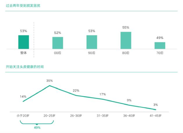 《白皮书》数据显示,过去两年时间受到脱发困扰的人群中,有52%的00后已经开始担心自己的发际线问题;90后中则有53%的人都受到脱发问题的困扰。同时,在受访者中,有49%的人是在25岁以前就开始关注自己的头皮健康问题。更令人惊讶的是,原本应该享受青春生活的小于20岁的受访者中,出现毛发问题忧虑意识的占比高达14%。
