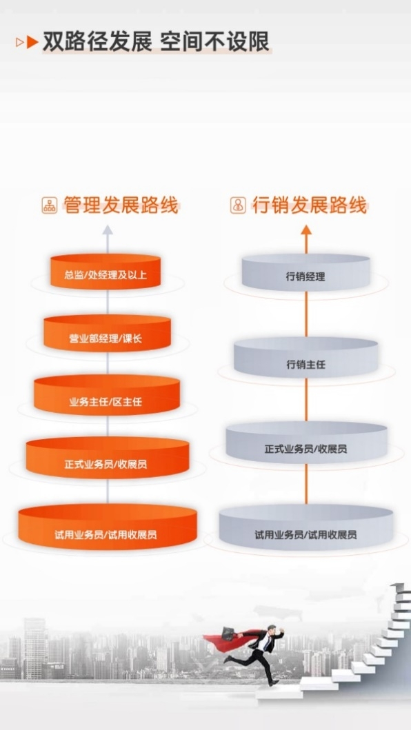 在平安人寿,还有个人销售及团队发展双通道成功路径由你选择。 个人销售路线聚焦个人成长,不仅可以成为专业化保险销售精英,还可以依托平安人寿平台,成为客户的生活助手。团队管理路线提供晋升发展平台,支持优秀人才实现低成本转型,做“保险团队管理者”。