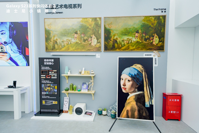 如果说三星The Frame画壁艺术电视为快闪店增添了古典艺术美感,那么三星The Serif画境艺术电视则为现场注入了现代设计之美。三星画境艺术电视采用云白色的三维时尚设计,机身侧面是独特的一体式字母“I”型,整体风格简约又不失优雅,可以利用支架自由摆放在各个位置,尽显自由灵动风采。令人惊喜的是,它还具备广色域显色体积与 HDR 10+,即使日光强烈的正午和光线昏暗的傍晚也可呈现出逼真清晰的画面,无论游客朋友们何时来打卡,都可收获色彩鲜活、清晰明亮的观看体验。