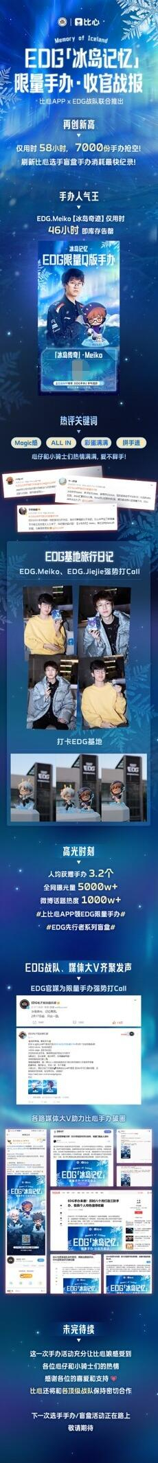 2023年2月17日,比心APP携手EDG战队以选手EDG.Meiko,EDG.Jiejie,Scout为原型,联合推出7000份“冰岛记忆”限量手办,纪念EDG战队冰岛夺冠的巅峰荣耀时刻。手办在比心APP上线后,仅仅2天半就火速抢光,在微博等主流社交媒体上好评如潮,深受战队粉丝和手办爱好者的喜欢和支持。