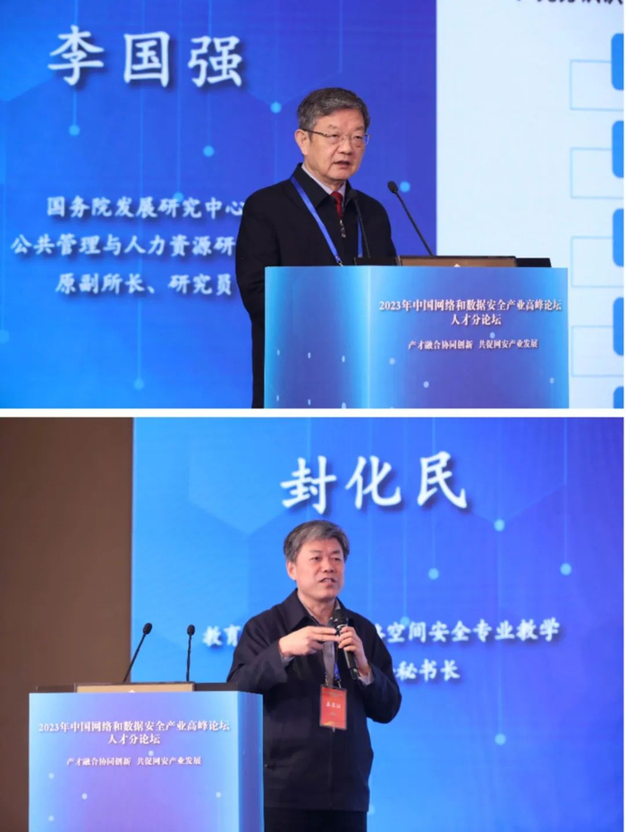 论坛专家演讲环节邀请了国务院发展研究中心公共管理与人力资源研究所原副所长、研究员李国强,教育部高等学校网络空间安全专业教学指导委员会秘书长封化民作主题演讲。两位专家分享了党的二十大报告关于新时代人才工作的内容解读以及新形势下如何做好网络与数据安全相关学科专业建设和人才培养的意见和建议。