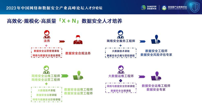 面对政府、企业对复合型、高质量数据安全人才的迫切需要,深信服基于在网络安全和数据安全领域深耕20 余年的成熟技术经验,以创新的「N + X」人才培养模式和精准科学的网络安全人才评价体系,推出数据安全微证书,旨在高效高质地为全行业培养数据安全“守护人”,全面促进网络安全、数据安全人才与产业高质量发展。
