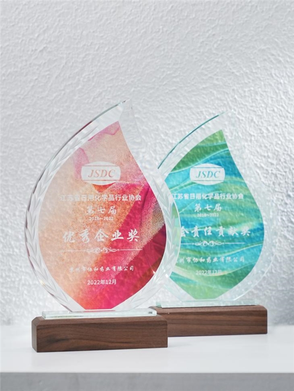 近日,江苏省日用化学品行业协会(以下简称江苏日化协会)在第八次会员大会暨八届一次常务理事会中,开展了2018-2022年度评选表彰活动,对过去5年中在日化行业中有突出贡献的企业进行表彰。经过“公开、公平、公正”的评选,苏州市协和药业有限公司(以下简称苏州协和药业)荣获江苏日化协会第七届优秀企业奖、社会责任贡献奖两项殊荣。