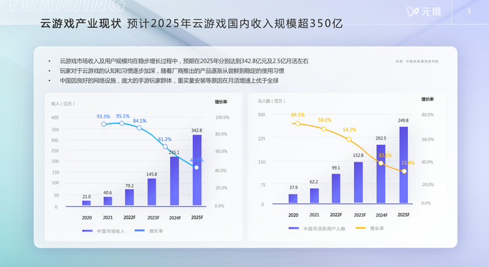 简单给大家分享一下云游戏现阶段的产业现状以及行业对云游戏未来的预测。信通院预测2025年云游戏整体收入在国内将达到350亿,并拥有2.5亿月活玩家。2022年是我们看到云游戏实质上进入规模化的一年,我们的不少客户都在逐步扩量增长的过程当中。玩家对于云游戏的认知也在逐步加深,从了解云游戏,到已经熟悉、习惯这种游戏模式,并且会进行持续体验及接受商业化付费,这是产业健康发展的一个很重要的特征。
