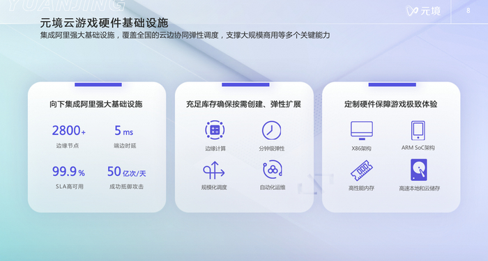另一方面是硬件的基础设施。云游戏有一个很明显的属性,接入点要离用户足够近。元境在这一方面有非常明显的优势,我们能够覆盖到全国2800个边缘节点,提供端边不超5毫秒的延迟,同时这个网络覆盖大、运行周期长,经历了很多过往CDN业务的考验,其可靠性非常高,安全防护能力也非常强。