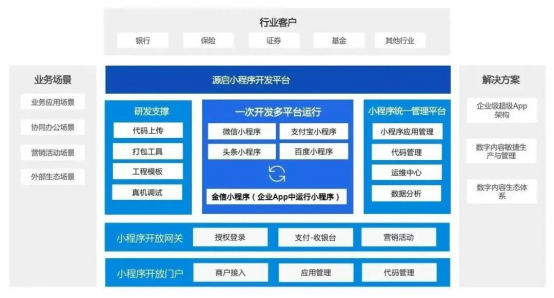 源启小程序开发平台基于源启金融级数字底座底层技术能力构建,安全、可靠。平台由一次开发多平台运行架构、小程序SDK、IDE小程序插件、小程序统一管理后台、小程序开放平台组成,金融客户可以通过该平台高效开发、定制小程序。
