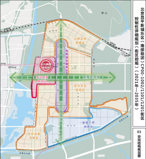 《昌平新城东区控规》提出,构建“一核、两带、多片区”的空间结构。其中,“一核”为多元消费体验核,提供“MALL+街区式”等复合多样化的消费空间,引入众多龙头项目,形成体验消费的热点;“两带”由南北向的综合服务带和东西向的景观游憩带组成十字带,形成城市重要服务廊道和景观廊道;“多片区”即多元消费体验区、市民综合服务区、智慧产研创新区、山前品质宜居区等六大功能片区。
