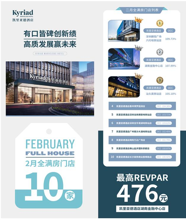 最新数据显示,今年2月,凯里亚德的经营表现,在快速复苏的商旅市场中十分亮眼,再一次用惊艳的业绩表现证明了其在中高端国际酒店品牌中的竞争力。在迈点2023年1月份的品牌指数MBI排行榜中,凯里亚德连续两个月蝉联中端酒店国际品牌第一名。目前,凯里亚德中国发展总规模已超380家,中国市场在营门店超200家,随着商旅市场的全面复苏,其市场布局还将进一步提速。