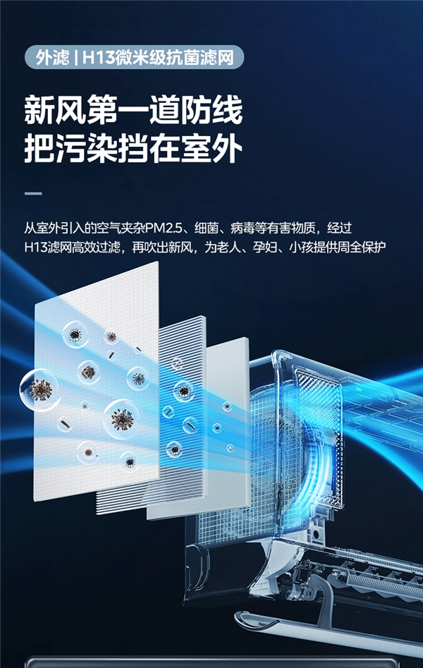 不仅守候安静舒适的居家环境,静新风同样守护室内空气健康,采用H13微米级抗菌滤网,能够高效过滤PM2.5、花粉、雾霾等8种病菌,其中PM2.5过滤效率高达99.95%,如同给空调“戴上口罩”。搭配第四代内机智清洁,运用巴氏高温杀菌技术,全程30分钟持续56℃高温深度杀菌,以及微正压换新风技术保持室内空气洁净,老人、孕妇、小孩等对空气质量有着高要求的人群也可以畅快呼吸,尽情享受健康空气。