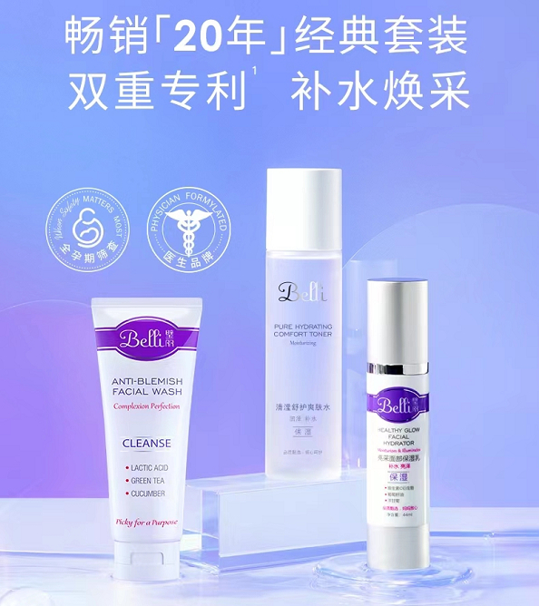 经典三步,唤醒水润美肌。选择Belli璧丽补水三件套,双重专利成分,补水焕采,一套满足肌肤所需,助力每一个消费者,尤其是准妈妈们都能收获自然水嫩好肌肤!