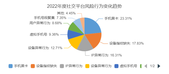 从2022年社交平台各个风险节点来看,整体分布较为均匀,平均在8%左右浮动,社交作为日常化的需求,虽没有体现出明显的淡旺季,但这在一定程度上说明了黑灰产已经渗透到社交平台的各个环节。