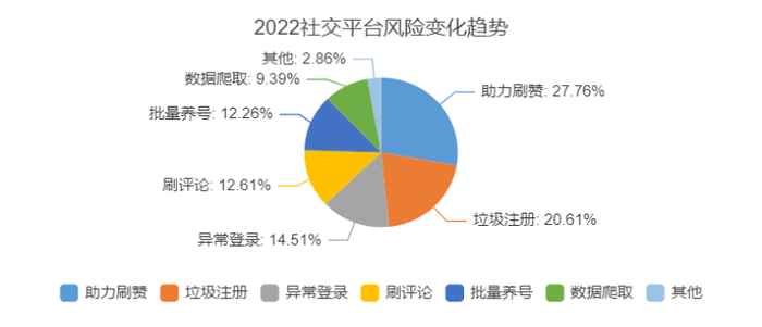 监测发现,2022年社交平台的主要风险集中在垃圾注册、异常登录、批量养号、刷赞助力、刷评论、数据爬虫等6个方面。其中,刷赞助力场景风险最高,为27.76%,其次为垃圾注册相关风险,为20.61%。
