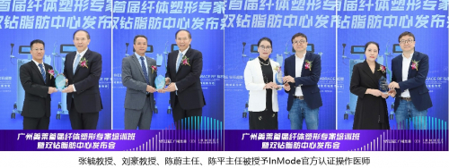 在本次活动现场,InMode盈美特公司为广州美莱整形外科医生张毓教授、整形外科医生刘豪教授、中医形体科医生陈蔚主任、中医形体科医生陈平主任,进行简单而隆重的InMode官方认证操作医师授牌仪式。