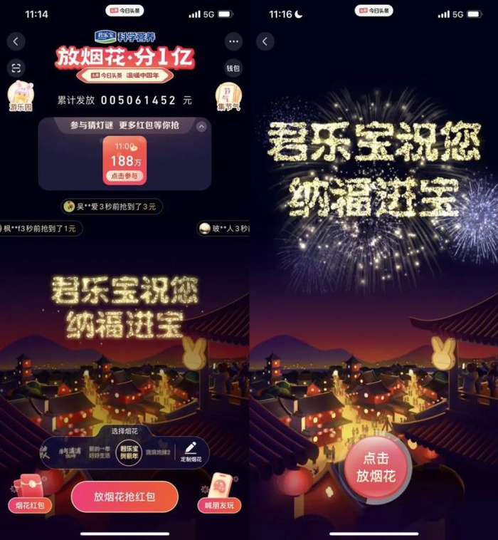 在红包与卡券发放过程中,为不同用户设置了多元化的互动玩法,比如小游戏、烟花大会、新春答题、朋友红包、鲜时光TV等多种互动模块,兼顾春节场景的趣味性,同时实现活动与品牌的大曝光。此外还创新上线“万物送福”和“幸运盒子”,助力品牌在春节尝鲜实现更广泛的曝光。