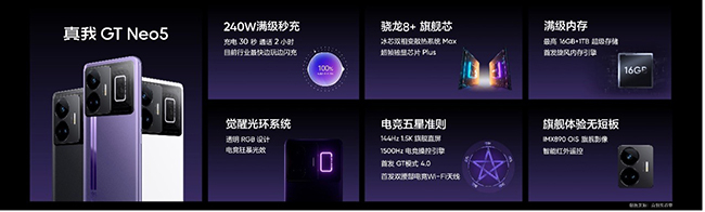 除同款240W满级秒充技术外,真我GT Neo5搭载第一代骁龙8+ 5G和超帧独显芯片Plus,搭配LPDDR5X+UFS3.1超频版,更带来16GB+1TB的超旗舰内存组合,性能强劲,更配备真我首发旋风内存引擎,带宽瞬发技术、智能预加载技术、异步内存管理技术、APP断电续读技术为消费者带来体验升级。