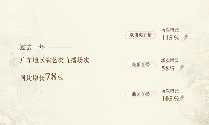 2月28日,抖音直播在广州举办开放日活动,并发布《2023抖音演艺直播数据报告·广东篇》。报告显示,过去一年,广东演艺类直播场次达到239万场,同比增长78%。其中,戏曲类直播场次增幅尤为显著,增长达115%,对应直播打赏收入增长126%,云端演出已成为戏曲表演的新门票。