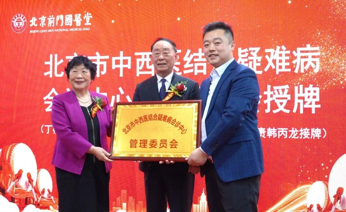 国医大师唐祖宣、国医大师丁樱为“前门国医堂”颁发“北京中西医结合疑难病会诊中心管理委员会”牌匾。