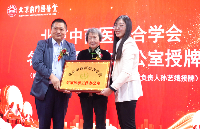 国医大师、我国著名中医妇科专家肖承悰,北京中西医结合学会秘书长刘刚为“前门国医堂”颁发“北京中西医结合学会名家传承工作办公室”牌匾。