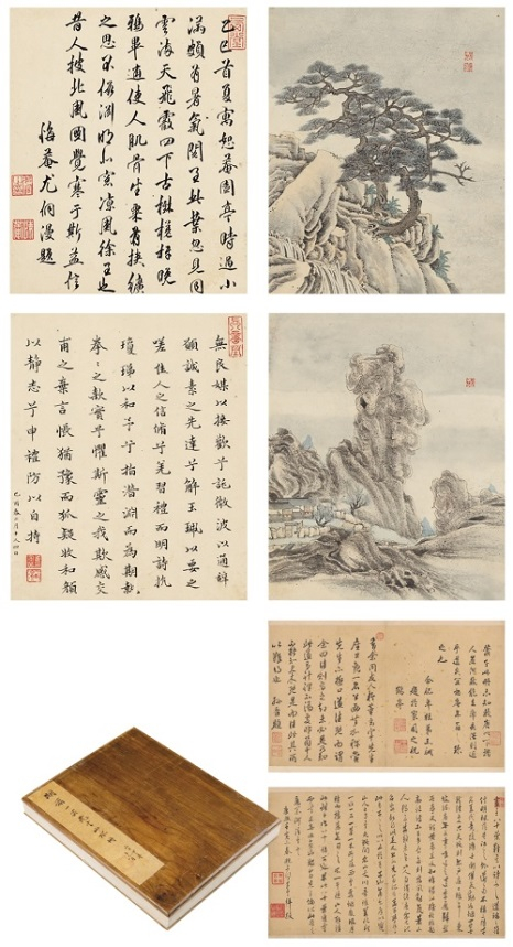 北京故宫博物院藏有萧一芸同尺寸、同形制、同上款的山水册二十开,是学界公认的范本。本件同为二十开,与故宫本原为上下半本。且本件当为后半部,保留了原册的题跋部分。