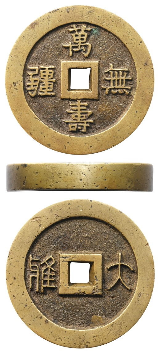 “万寿无疆”是祝寿的颂语。背文“大雅”,是慈禧太后叶赫那拉氏御用画室的斋名——大雅斋。此枚“万寿无疆背大雅”宫钱,系由宫廷监铸,直径62.9毫米,厚达11.9毫米,重达271.1克,文字端庄,字口深峻,大气美观,包浆自然。特别是钱体厚重,制作精整,超过明清时期政府铸造的、用以流通的制钱几十倍有余,形制上开宫钱厚重之先河,极具宫廷堂皇之气,凸显了其作为最高统治者赏玩之物的皇家气派。