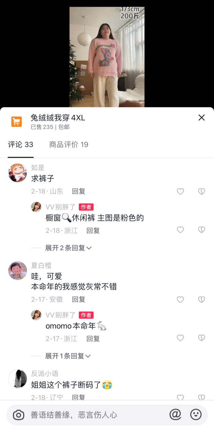 “大码女孩都是很害羞的,甚至不敢、不喜欢在直播间问问题(给出身高体重,询问尺码等),她们更喜欢在我的橱窗里自助购物。”VV认为,橱窗是更适合大码女孩们购物的一种方式。