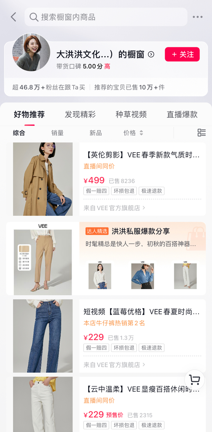 此后的很长一段时间内,团队的做法是“只要直播间转化数据高于平均值的,都值得在橱窗挂一下”。200多件商品挂在大洪洪的橱窗里,供粉丝们浏览购物,“但现在看来太多、太乱了”,且没有发挥出短视频+橱窗的真正价值。