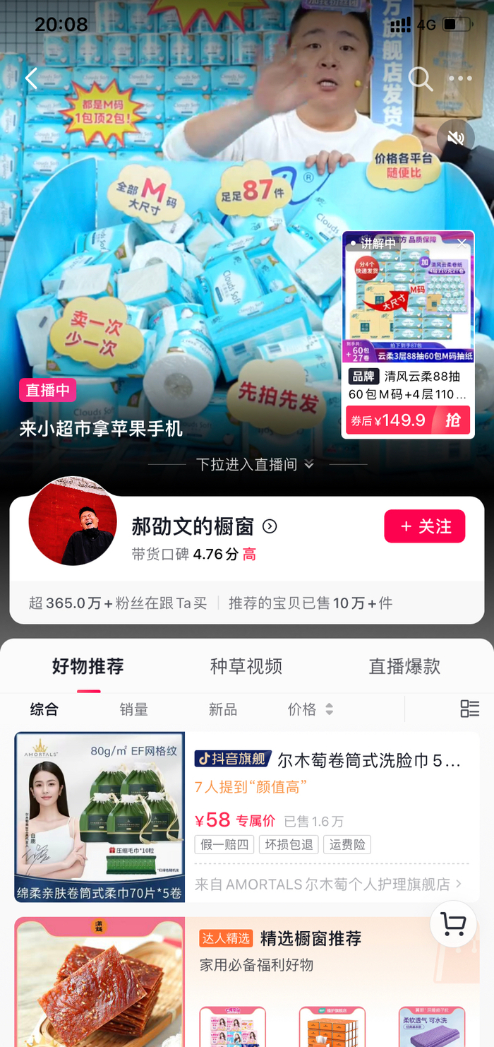 29.9元的某品牌洗脸巾在郝劭文橱窗卖得很好,2月销量就超过50万单。上架橱窗前,郝劭文曾在直播间里把这款洗脸巾卖爆了,他亲自用洗脸巾擦脸,讲解它的厚度、不掉棉絮、价格实惠,下播时告诉大家用完了直接到橱窗里去买,与直播间同福利,吸引了不少老顾客复购。