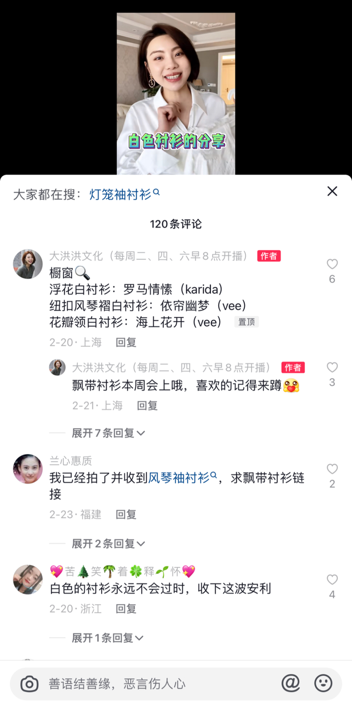 即使大洪洪品味独到、搭配经验丰富,但莉姐仍认为,直播间不是大洪洪的优势“战场”。抖音电商上,服饰行业达人非常多,直播卖货成绩好的主播人才济济,比气氛、比套路、比时间精力,大洪洪“卷”不过同行。