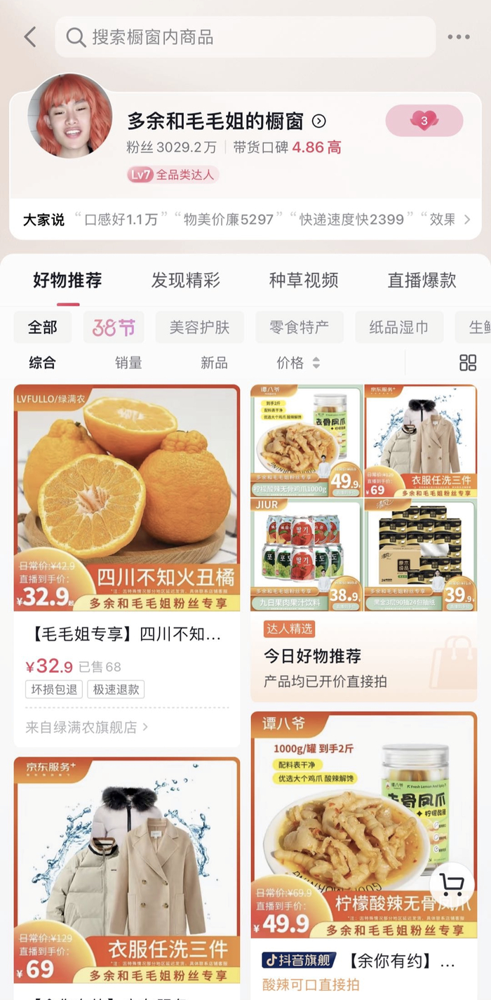 把直播和短视频里的高转化商品上架橱窗,粉丝们的长尾需求得以持续释放。橱窗迎新暖心购活动期间,多余和毛毛姐的橱窗GMV环比增长196%。多余直播团队目前的想法是,把橱窗打造成服务粉丝的复购阵地,直播爆款都可以在橱窗里再下单。