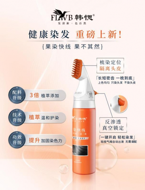 2022年,韩愢提出了“正确染发 只需补染”的健康染发新理念,在便捷补染品类方向上继续拓展延伸,到2023年,研创出应用“二元太空舱”锁鲜技术的染发膏“果染快线”,一键定量便捷梳染补染,通过瓶身技术创新设计,实现料体锁鲜,另外抓准用户重视健康染护的需求,配合升级3倍植萃添加量,在护发层面上加码,满足中老年群体的健康盖白染发需求。