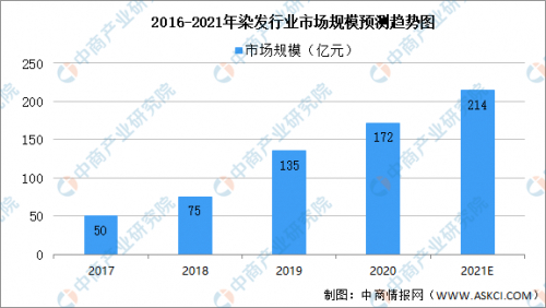 近两年,随着人口老龄化时代的到来,银发族这个消费群体不断壮大,带动在家染发这个需求兴起壮大,同时也让家用染发剂这个市场在疫情这个艰难的大环境下注入一股强有力的增长动力。此前两年已有数据显示,我国染发行业市场规模由2017年50亿元增至2019年135亿元,2021年我国染发行业市场规模可达214亿元。