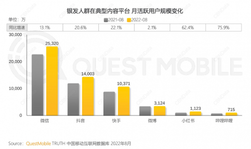 随着人口老龄化浪潮的到来,短视频平台上的银发用户将会越来越多。据QuestMobile发布的《2022银发经济洞察报告》显示,截至2022年8月,银发人群已成为互联网流量增长的重要群体,同比2021年,短视频平台银发人群月活跃规模更大,增速更明显。