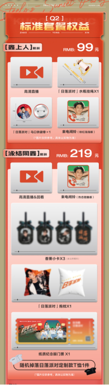 “巡演每一场还是依旧给大家准备了很多不一样的惊喜。”接下来的『日落派对』天津站,全能音乐人赵泳鑫将为大家带来焕然一新的极致live演出。《酷狗首唱会》为本场演出特别准备了“鑫上人”、“泳结同鑫”不同标准权益套餐。其中“鑫上人”套餐包含高清直播功能,加上水瓶挂绳、马口铁徽章以及来电闹铃(粉红泡泡版);“泳结同鑫”则包含高清直播&回看功能、来电闹铃(粉红泡泡版),还有香薰小卡*3、抱枕等周边福利,还将随机掉落『日落派对』定制款T恤。套餐数量有限,小伙伴们赶紧上酷狗音乐、酷狗直播开抢吧!