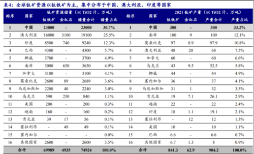 全球钛矿资源以钛铁矿为主,集中分布于中国、澳大利亚、印度等国家。根据USGS数据,截至2021年全球钛矿资源储量合计约7.49亿吨(以TiO2计),其中钛铁矿与金红石资源储量分别7.0亿吨、0.49亿吨,分别占比93.41%、6.59%。分地区来看,全球钛矿资源主要分布在中国、澳大利亚、印度等国家,其中中国钛矿资源最为丰富,合计储量2.3亿吨,占比达到30.7%。