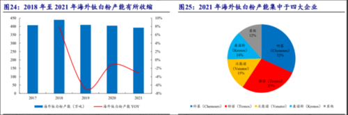 国内钛白粉生产以中小企业为主,未来行业集中度有望进一步提升。根据陈钢等(2022年)发布的《2021年中国钛白粉行业经济运行分析及未来发展》,截至2021年,国内钛白粉行业具有正常生产条件的全流程生产企业共计42家,总产能达到448.7万吨/年。其中,生产企业多以中小企业为主,钛白粉产能低于10万吨/年的企业数量达到28家,占比66.67%。展望未来,我们认为未来伴随行业中小企业落后产能的逐步出清,国内钛白粉行业集中度有望进一步提升。