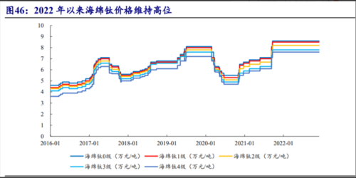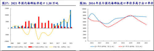 国内海绵钛仍有部分高端产品依赖进口,2021年净进口量1.30万吨尽管国内海绵钛产量稳步增长,但海绵钛品质尚有所欠缺,产品结构偏中低端,仍有部分高端海绵钛依赖进口。根据Wind数据,2021年国内海绵钛进口13835吨、出口841吨,净进口12994吨。同时,从进出口单价来看,2014年至今国内海绵钛进口单价多高于出口单价,截至2021年进出口单价分别为7568美元/吨、5138美元/吨。
