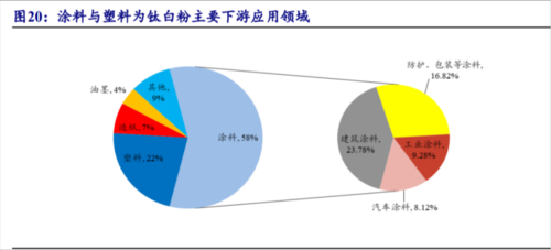 涂料与塑料行业为钛白粉主要的下游应用领域。根据公司2021年年报,全球钛白粉产品消费结构中,涂料、塑料为前两大需求来源,占比分别达到58%、22%。其中,在涂料方面,建筑涂料作为最大的应用领域,占钛白粉总需求的23.78%。