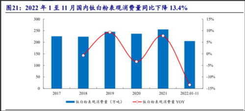 下游需求疲软,钛白粉行业现处于景气低点。2017年至2021年间,国内钛白粉表观消费量稳中有升,年消费量由226万吨逐步增加至256万吨,年均复合增速达到3.13%。2022年以来,受宏观经济增速放缓及地产行业景气度下滑影响,国内钛白粉下游需求萎靡,1至11月表观消费量205万吨,同比下降13.4%。