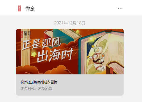 在2021年5月柳州螺蛳粉制作技艺经国务院批准列入第五批国家级非物质文化遗产代表性项目名录半年后,已有不少海外渠道拓展经验的微念决心要探索中国品牌国际化表达的更多可能性便着手筹备出海事业部。2021年年底,微念提出“一起让悠远的中国故事和特色品牌跨越山海被更多人看见”的愿景,并在全网发布招聘启事,招纳海外媒体传播策划、海外品牌营销策划、海外商务经理等人才组建出海事业部。