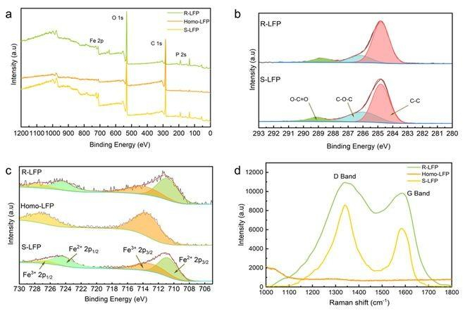 使用X射线光电子能谱对各样品表层元素价态进行分析。在S-LFP中,C-O-C与C-C的峰面积比值为0.44。而在R-LFP中,这个比值是0.21,这表明R-LFP在碳层中的缺陷较少。在S-LFP中,Fe 3+与Fe 2+峰面积比值为0.67,而在R-LFP中为0.53,表明再生样品中的 Fe 3+杂质较少。通过拉曼光谱进一步分析样品中碳的石墨化程度。废旧磷酸铁锂中D峰与G峰比值为1.40,而在再生磷酸铁锂中该比值为1.11,表明再生样品的石墨化程度较高。而经过均质处理后的样品中没有发现D峰与G峰的存在,均质处理过程中已经将原有的碳彻底去除,为后续再生工艺提供一个良好的条件。