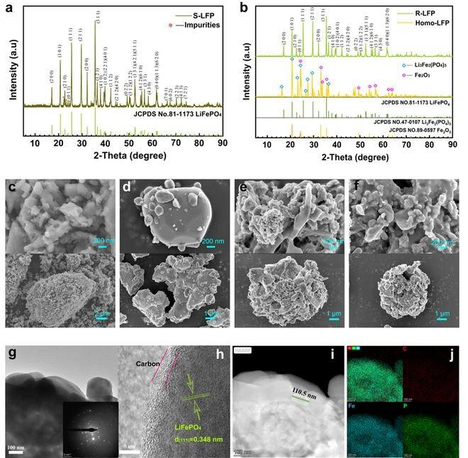 图2. 样品的物相分析和微观形貌。(a) S-LFP (b) Homo-LFP和R-LFP的XRD图; (c) S-LFP,(d) Homo-LFP,(e) 喷雾干燥后的LFP和 (f) R-LFP的SEM图像;(g, h) R-LFP的TEM图像;(i, j) R-LFP的HAADF-STEM图像和元素分布