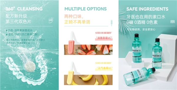 牙套保持器(牙套、假牙)清洁片则采用了全新一代双色片配方,加入活性氧除菌成分和TAED(四乙酰易二胺),采用活性氧微分子渗透技术,深入稳定,除菌率达99.999%,不伤害牙套保持器的材质,获得欧盟CE认证。正畸雪糕款果漾咬胶和正畸保护蜡等产品则分别采用了美国FDA食品级硅胶和英国进口食品级蜜蜡,让正畸用户对护理品入口的安全问题安心无忧。