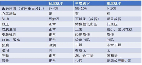 脱水程度的判断需要依据丢失体液量、皮肤弹性、黏膜、前囟及眼窝凹陷程度、肢端温度、尿量、脉搏及血压的情况进行综合评估。分为轻度脱水,中度脱水及重度脱水。