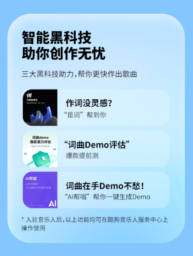 在音乐内容打造方面,为了让更多人享受到黑科技的便利、解决创作痛点,“凌音引擎”还为酷狗音乐人提供了含「AI帮唱」、「词曲Demo爆款潜力评估」以及「歌曲智能封面制作」的功能与服务,目前,这些均可通过酷狗音乐APP侧边栏-创作者平台中找到并使用。其中,最新上线的「AI帮唱」功能,在酷狗音乐人上传人声Demo后,可通过替换成平台提供的不同风格音色生成相应的歌曲Demo,如深情/冷清、戏腔/说唱、青年/成熟等,覆盖情感、曲风、年龄等多个维度的歌手声线,堪称声音版的“换脸神器”。