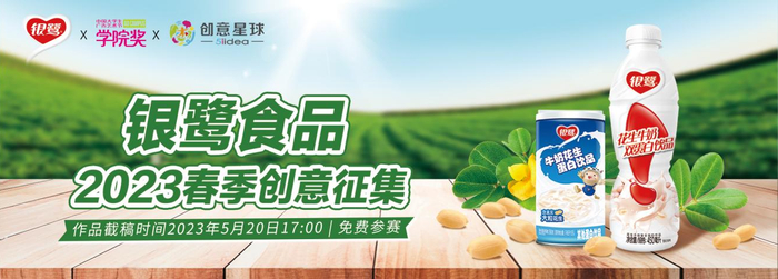 新赛季,新挑战!学院奖2023春季征集大赛,银鹭设置了平面广告、影视广告、短视频、营销策划、广告文案、包装设计等六大类别,创意青年们须在银鹭牛奶花生、银鹭花生牛奶、银鹭花生乳三大产品及主题中任选其一创作,当然也可以考虑结合三类产品含有花生的特点来创作。