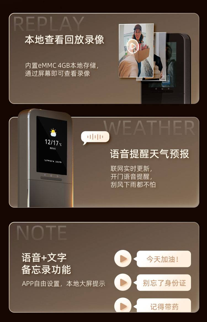 乐橙ROCK1-vp本次的亮点,还在于内置3.5寸隐藏式高清屏幕,结合APP实现双屏联动,为家居生活提供真正的智能便利,使守护融入日常。ROCK1-vp的本地屏幕搭载回放录像功能,在本地屏幕上即可查看门前过往记录,无需打开手机。除此之外,屏幕还配备智能备忘录功能,用户可以在APP中记录一些重要事项,例如会议时间、生日等等,在开门时,ROCK1-vp通过屏幕提醒用户,避免错过或遗漏。此外,用户还可以设置语音提示,在出入时,门锁便会提醒当日天气、出行注意事项等,方便用户随时了解天气情况,做好出行准备。