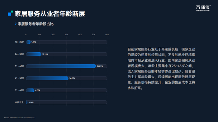 数据显示,主要集中在25~45岁之间,流入家居服务业的年轻群体占比较少。随着主力军年龄增大,后续可能出现服务断层现象,人力成本将持续提升,服务价格也将水涨船高。