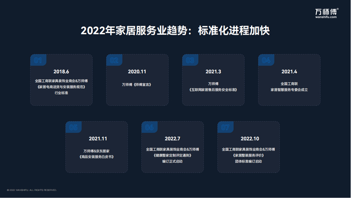 对于任何一个尚未进入成熟期的行业来说,标准化是可持续发展的重要课题。 2022年,全国工商联家具装饰业商会主导的《健康整家定制评定通则》《家居整装服务评价》团标等行业标准启动编订,持续推动家居服务行业走向规范化、标准化。与此同时,万师傅“师傅职业化实验基地”正式开放,通过系统输出课程加速职业教育,以服务者职业化推动行业实现标准化。