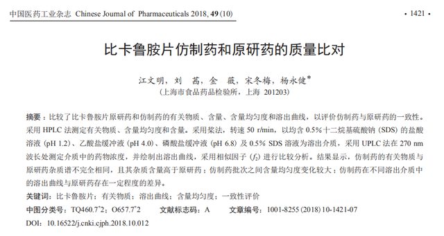 2018年,上海市食品药品检验所在《中国医药工业杂志》发表论文,研究人员分别对阿斯利康(AstraZeneca)旗下的原研药比卡鲁胺(bicalutamide)及其仿制药进行了质量比对,结果发现:仿制药的杂质含量均高于原研药,即仿制药的生产质量低于原研药;仿制药的安全性、有效性普遍低于原研药;仿制药的药物溶解度与原研药不完全一致。这些都说明仿制药无法完全达到原研药对人体的疗效。