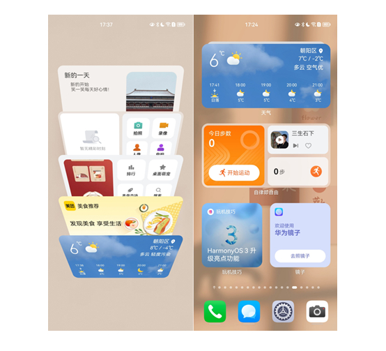首先,全新的卡片夹功能支持堆叠相同尺寸的卡片,上滑或下滑可以切换卡片,向下长滑可以展开全部卡片,节省更多桌面空间;其次,卡片夹也创造了卡片组合的方式,不同尺寸的服务卡片和快捷方式可以相互混搭成一个卡片,比如将运动健康和音乐卡片组合在一起,就能一边听歌一边查看运动数据,常用服务一“处”即达,让桌面更整洁,操作更高效。